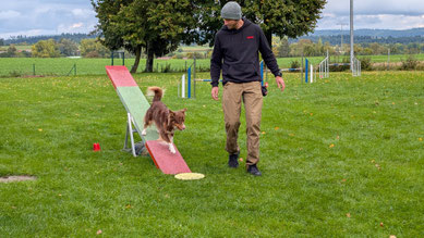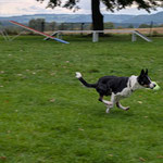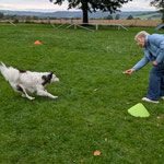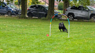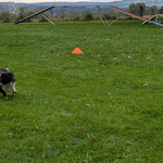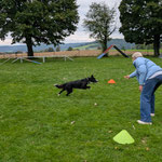 Weiter ging es mit Hoopers-Agility. Hier steht der Hundeführer in einem fest vorgegebenen Bereich und führt von dort aus seinen Hund auf Distanz durch den Parkour. Anders als beim Agility, wo der Hundeführer mit seinem Hund mitläuft.