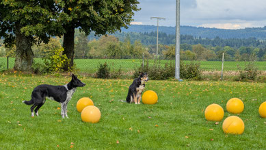 Nach einer kurzen Umbau-Phase zeigte dann Sonja mit Lilly und Romy eine Treibball-Vorführung. Hier wird der Hund zu größeren leichten Bällen geschickt die er dann zu einem Gate (Ziel) schieben soll. Der Hundeführer steht hier direkt vorm Gate und führt seine Hunde auf Distanz.